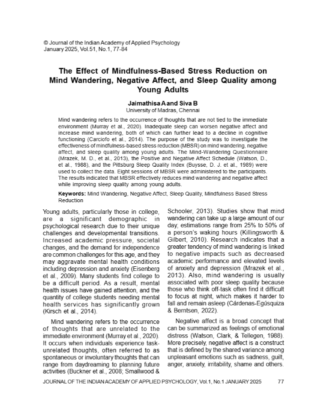 A., Jaimathisa & B., Siva (2025). The Effect of Mindfulness-Based Stress Reduction on Mind Wandering, Negative Affect, and Sleep Quality Among Young Adults. Journal of the Indian Academy of Applied Psychology. 51(1), 77-84.