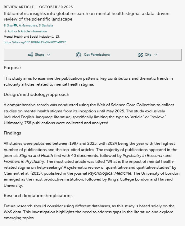 B., Siva & A., Jaimathisa & S., Sasikala. (2025). Bibliometric insights into global research on mental health stigma: a data-driven review of the scientific landscape. Mental Health and Social Inclusion. Emerald Publishing. 1-13. https://doi.org/10.1108/MHSI-07-2025-0197.
