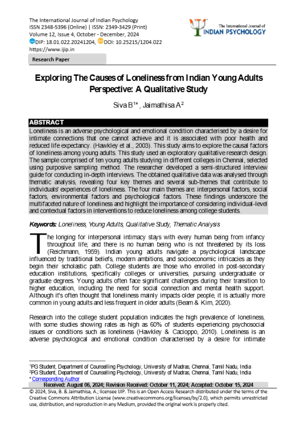 B., Siva & A., Jaimathisa (2024). Exploring the Causes of Loneliness from Indian Young Adults Perspective: A Qualitative Study. International Journal of Indian Psychology. 12(4), 210-217.